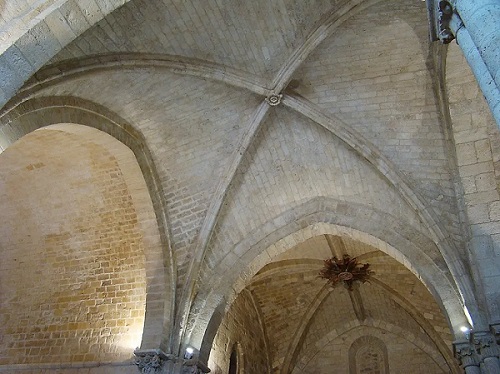 Formado por la intersección perpendicular de dos bóvedas de cañón apuntado (ojivales) de igual altura, la bóveda de arista apuntada se forma cubriendo espacios cuadrangulares.