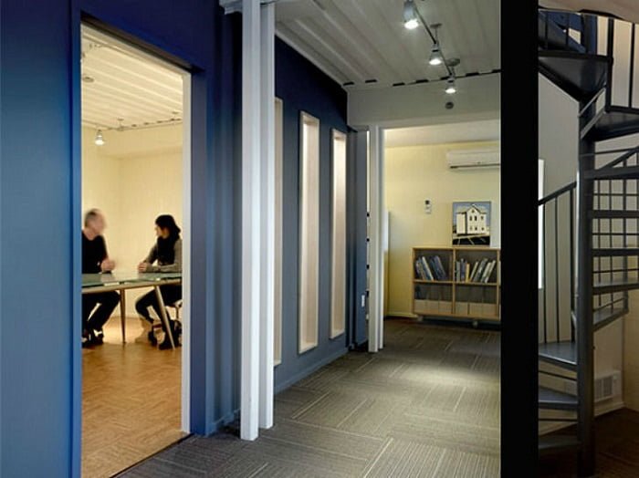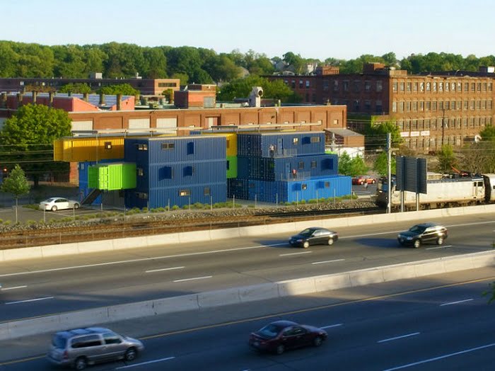 Oficina de correos de Rohde Island (USA). El edificio de oficinas, diseñado por Distill Studio, está construido con 32 contenedores de carga e incluye 12 oficinas y salas de conferencias. Las áreas de las oficinas oscilan entre, aproximadamente, 60m2 y 240m2. El edificio presenta un exterior alegre y colorido, además de un aislamiento de alto rendimiento y un control climático de bajo consumo.